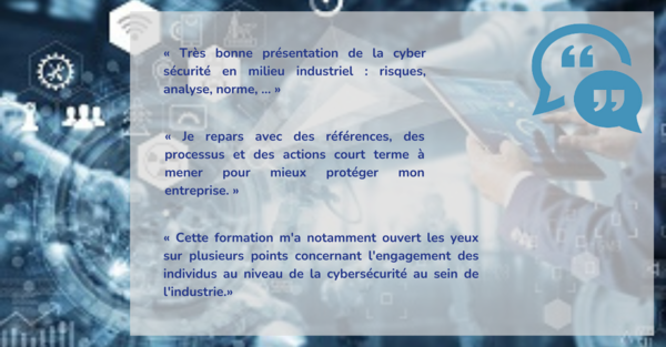La formation détaillera des processus et des méthodes qui permettent d’évaluer et de maitriser le risque cyber spécifique à l’industrie.