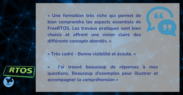 Cette formation vous guide pas à pas dans la mise en œuvre du noyau temps réel FreeRTOS sur microcontrôleur STM32. Grâce à une approche 100 % pratique, vous apprendrez à créer des applications multitâches, gérer les interruptions, optimiser l’usage des ressources, et tirer parti des périphériques et fonctionnalités du STM32.